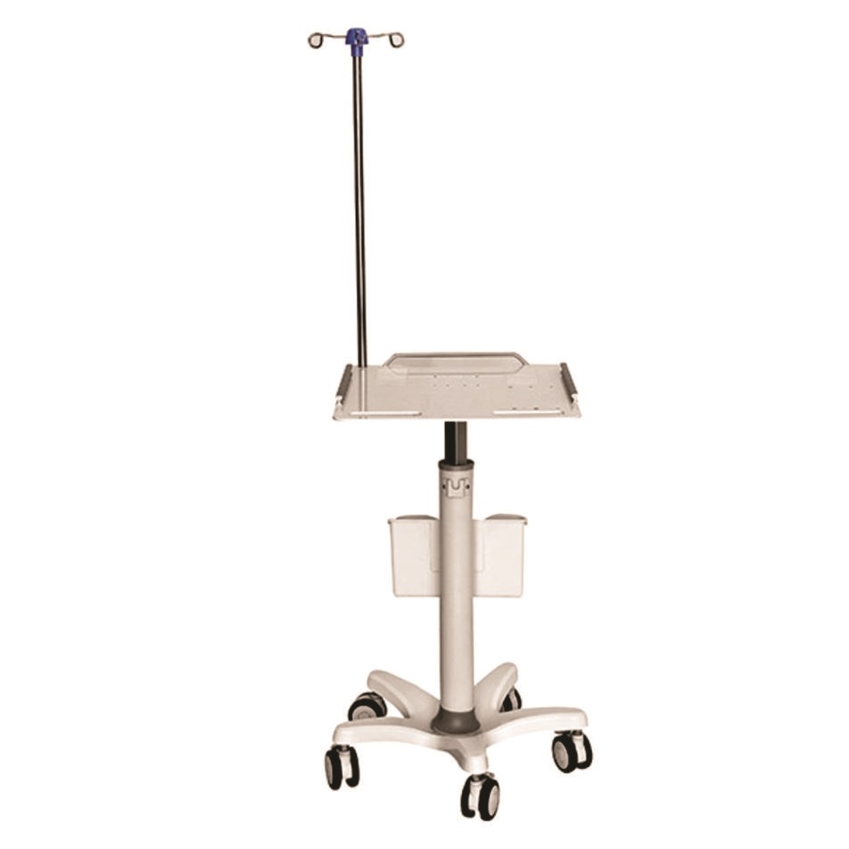 Carro con ruedas para unidades de ECG con una robusta estructura de 5 pies y 2 ruedas con frenos. Los accesorios de ECG, como el gel para electrodos, pueden guardarse al alcance de la mano en la cesta de almacenamiento. El soporte móvil es de altura ajustable y está equipado con una columna para el cable de paciente de ECG.